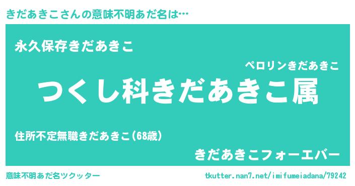 | 男性向けラノベタイトル風あだ名 | 『きだあきこ~年齢イコール彼女いない歴の魔法使い~』 |