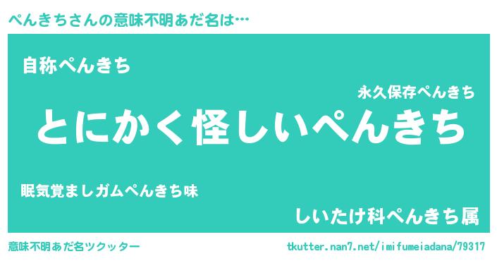 | 男性向けラノベタイトル風あだ名 | 『ダンジョンにぺんきちを求めるのは間違っているだろうか』 |