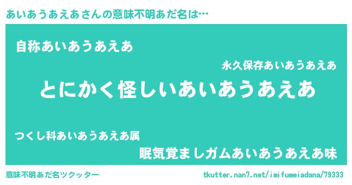 | 男性向けラノベタイトル風あだ名 | 『あいあうあえあの嫁は女の子じゃないと思った?』 |