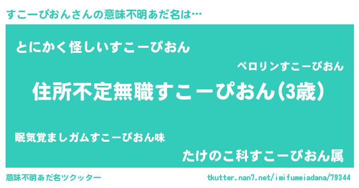 | 胡散臭い通販商品みたいなあだ名 | 『あなたにだけ特別に提供する100年もののヴィンテージワイン…その名も「すこーぴおん」』 |