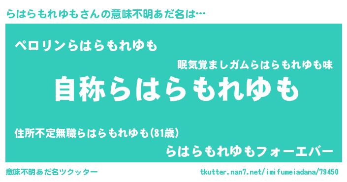 | 男性向けラノベタイトル風あだ名 | 『Re:らはらもれゆもから始める異世界生活』 |