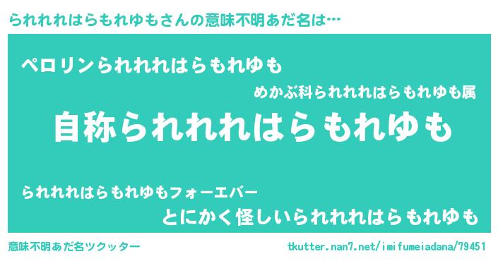 | 女子向けラノベタイトル風あだ名 | 『られれれはらもれゆもなんてお断りですっ。』 |