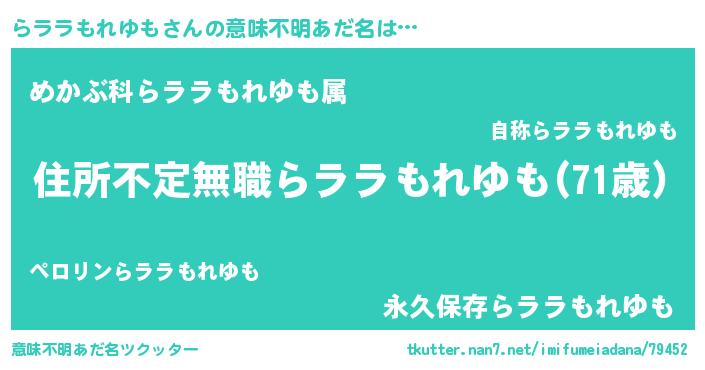 | 男性向けラノベタイトル風あだ名 | 『魔弾の王とらララもれゆも』 |