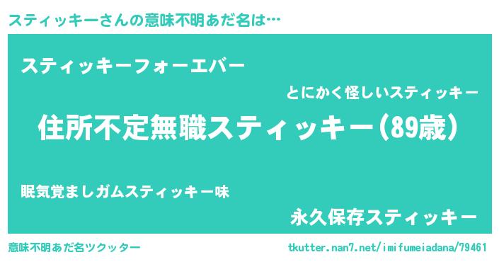 | 男性向けラノベタイトル風あだ名 | 『この素晴らしい世界にスティッキーを!』 |
