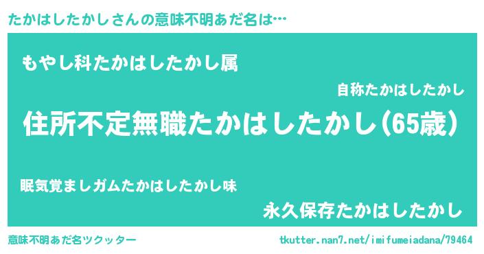 | 男性向けラノベタイトル風あだ名 | 『魔弾の王とたかはしたかし』 |