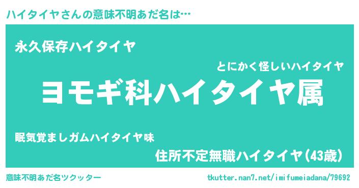 | 男性向けラノベタイトル風あだ名 | 『うちのハイタイヤが世界を掌握している!』 |