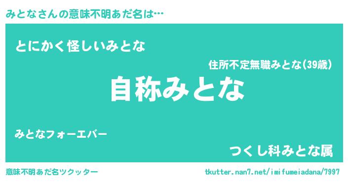 | 男性向けラノベタイトル風あだ名 | 『Re:みとなから始める異世界生活』 |