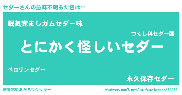 | 男性向けラノベタイトル風あだ名 | 『うちのセダーが世界を掌握している!』 |