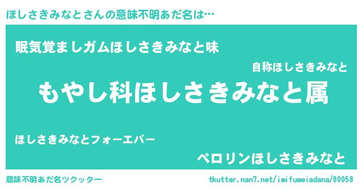 | 男性向けラノベタイトル風あだ名 | 『転生したらほしさきみなとだった件』 |