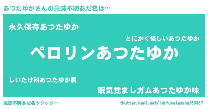 | 胡散臭い通販商品みたいなあだ名 | 『億万長者になれるブレスレット…その名も「あつたゆか」』 |