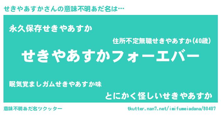 | 男性向けラノベタイトル風あだ名 | 『せきやあすかに滅ぼされるだけの簡単なお仕事です』 |