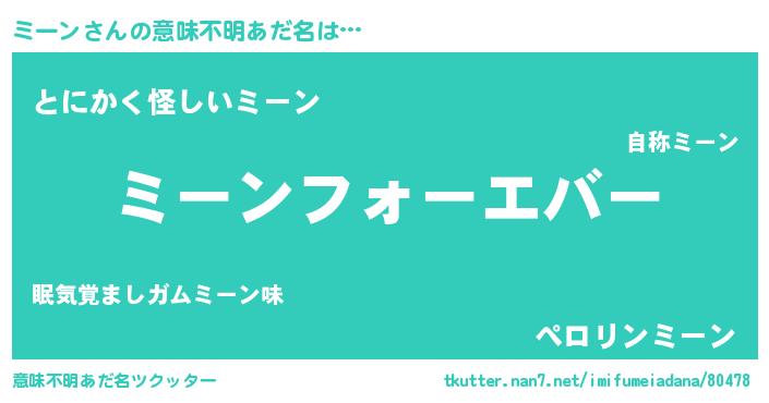 | 女子向けラノベタイトル風あだ名 | 『ミーンの雑貨屋さん』『ミーン恋絵巻』 |