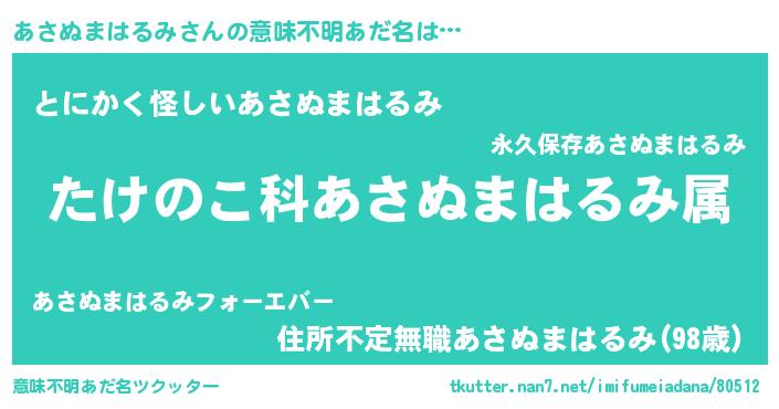 | 男性向けラノベタイトル風あだ名 | 『転生したらあさぬまはるみだった件』 |