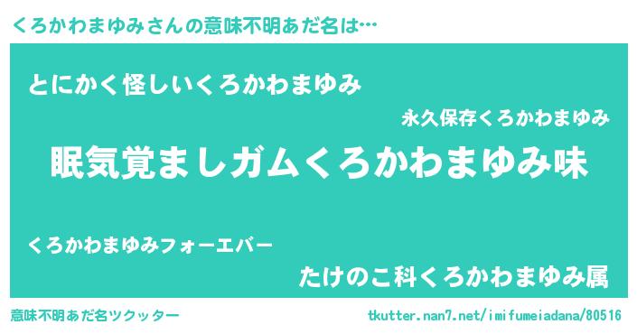 | 男性向けラノベタイトル風あだ名 | 『おまえをオタクにしてやるから、俺をくろかわまゆみにしてくれ! 』 |
