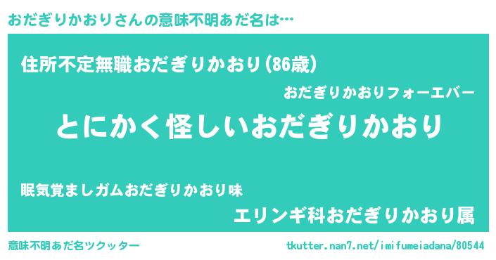 | 男性向けラノベタイトル風あだ名 | 『うちのおだぎりかおりが世界を掌握している!』 |