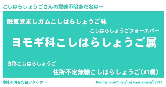 | 男性向けラノベタイトル風あだ名 | 『こしはらしょうご~年齢イコール彼女いない歴の魔法使い~』 |