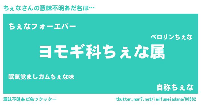 | 男性向けラノベタイトル風あだ名 | 『うちのちぇなが世界を掌握している!』 |