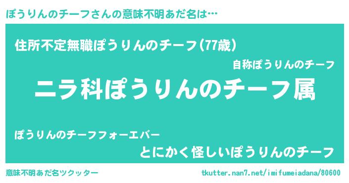 | 欧米人風あだ名 | 『トリンドルぽうりんのチーフ』 |
