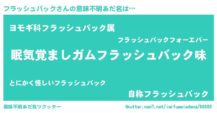 | 男性向けラノベタイトル風あだ名 | 『おまえをオタクにしてやるから、俺をフラッシュバックにしてくれ! 』 |