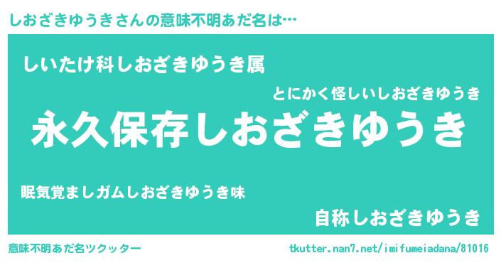 | 男性向けラノベタイトル風あだ名 | 『しおざきゆうきという概念が存在しない退屈な世界 』 |