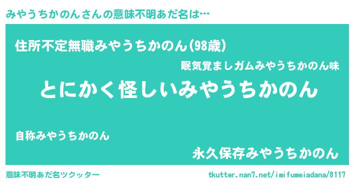| ヘコむあだ名 | 『みやぷりん』『みやうちかのん(遠い目)』 |