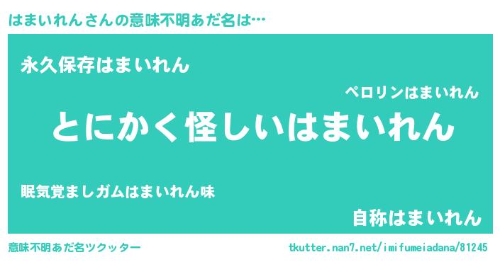 | 女子向けラノベタイトル風あだ名 | 『はまいれんの卵を拾いまして』 |