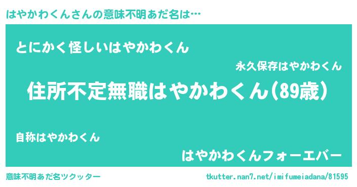 | 男性向けラノベタイトル風あだ名 | 『魔弾の王とはやかわくん』 |
