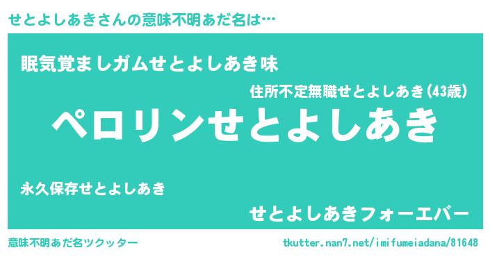 | 男性向けラノベタイトル風あだ名 | 『せとよしあきの憂鬱』 |