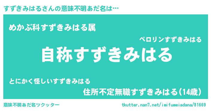 | 男性向けラノベタイトル風あだ名 | 『Re:すずきみはるから始める異世界生活』 |
