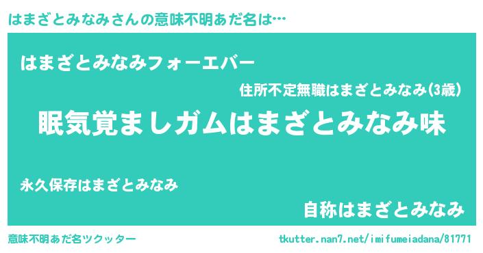 | 女子向けラノベタイトル風あだ名 | 『はまざとみなみ夫妻のなれそめ』 |