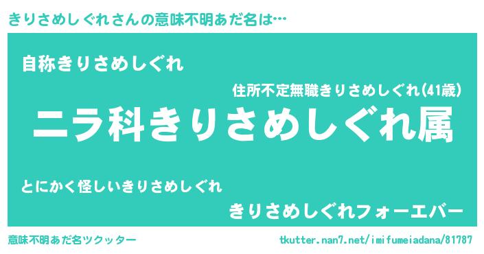 | 女子向けラノベタイトル風あだ名 | 『きりさめしぐれの玉の輿計画!』 |