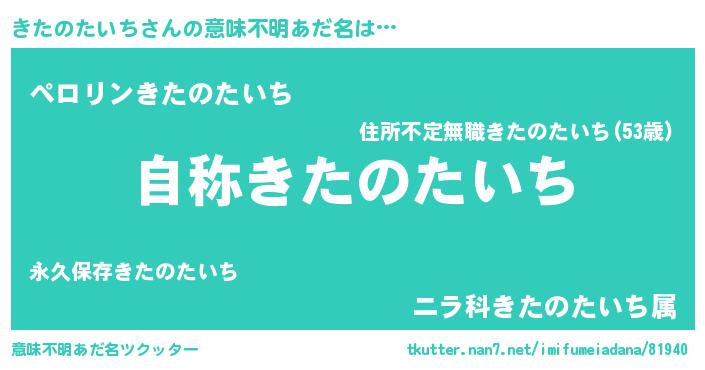 | 男性向けラノベタイトル風あだ名 | 『Re:きたのたいちから始める異世界生活』 |