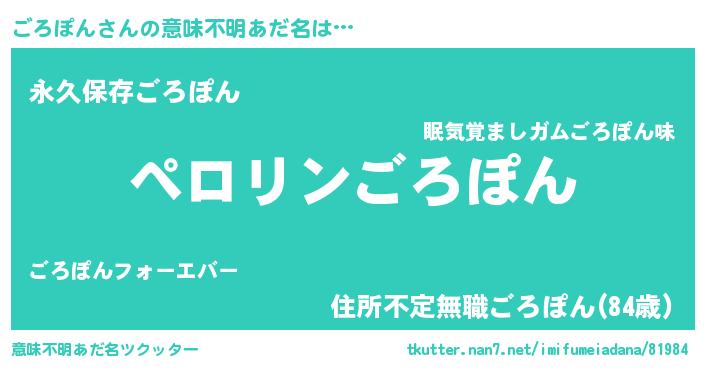 | 男性向けラノベタイトル風あだ名 | 『ごろぽんの憂鬱』『魔弾の王とごろぽん』 |