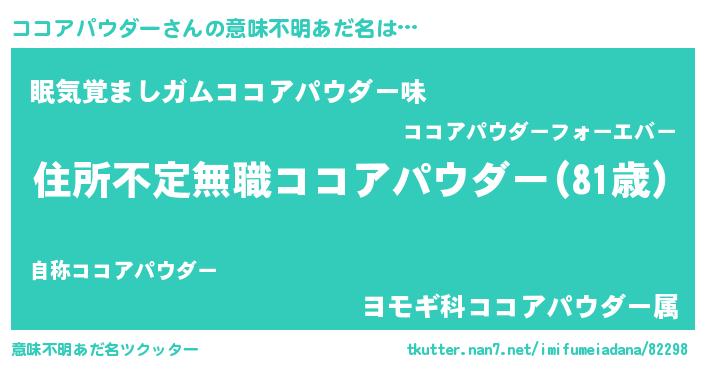 | 女子向けラノベタイトル風あだ名 | 『悪役ココアパウダーに転生したようですが、知った事ではありません』 |