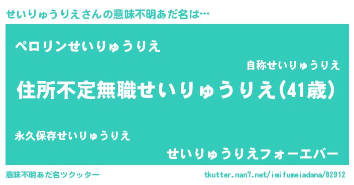 | 男性向けラノベタイトル風あだ名 | 『うちのせいりゅうりえが世界を掌握している!』 |