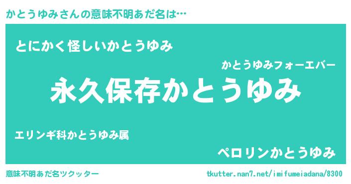 | 胡散臭い通販商品みたいなあだ名 | 『来世でも幸せになれる健康食品…その名も「かとうゆみ」』 |