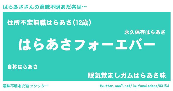 | 男性向けラノベタイトル風あだ名 | 『はらあさに滅ぼされるだけの簡単なお仕事です』 |