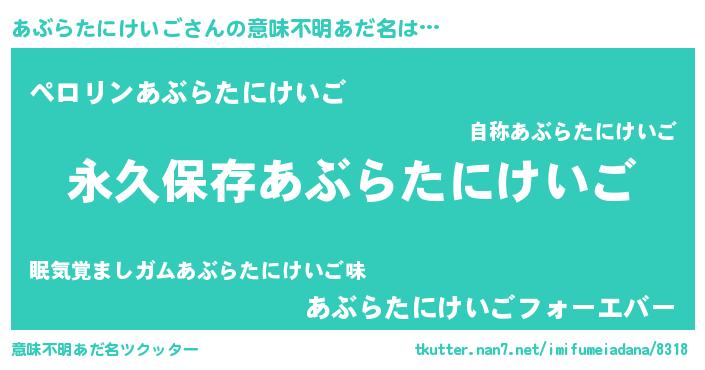 | 女子向けラノベタイトル風あだ名 | 『異世界でカフェあぶらたにけいごを開店しました。』 |