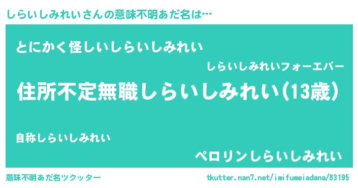 | 伝説のあだ名 | 『解き放たれた魔法使いしらいしみれい』 |