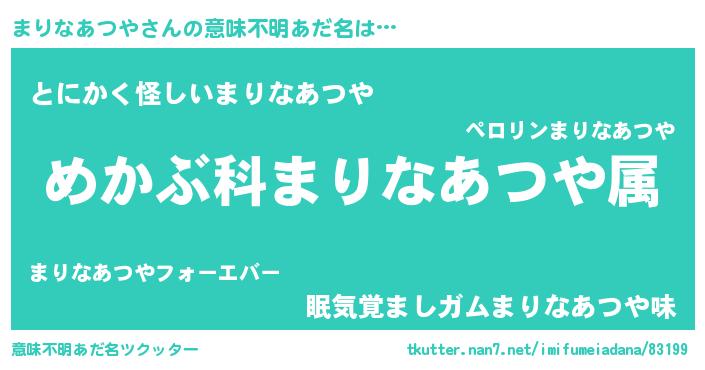 | 男性向けラノベタイトル風あだ名 | 『マリナアツヤスレイヤー』 |
