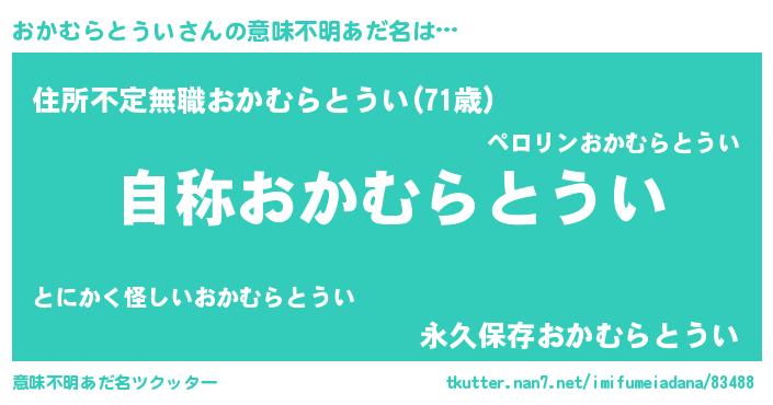 | 男性向けラノベタイトル風あだ名 | 『Re:おかむらとういから始める異世界生活』 |