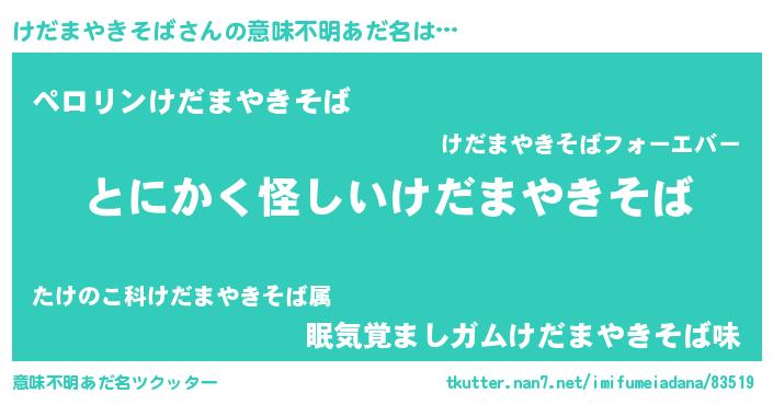 | 男性向けラノベタイトル風あだ名 | 『ダンジョンにけだまやきそばを求めるのは間違っているだろうか』 |