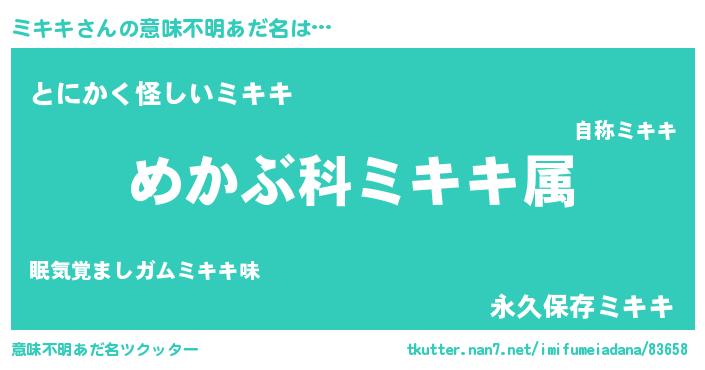 | 胡散臭い通販商品みたいなあだ名 | 『信頼と実績のサプリメント…その名も「ミキキ」』 |