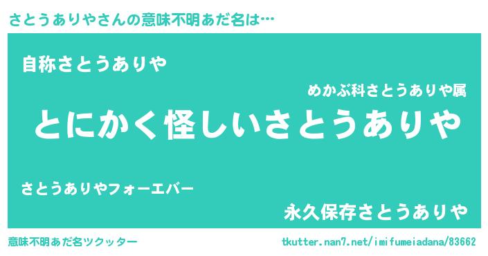 | 男性向けラノベタイトル風あだ名 | 『さとうありやの嫁は女の子じゃないと思った?』 |