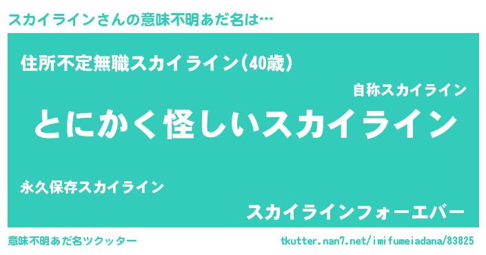 | 男性向けラノベタイトル風あだ名 | 『スカイラインの嫁は女の子じゃないと思った?』 |