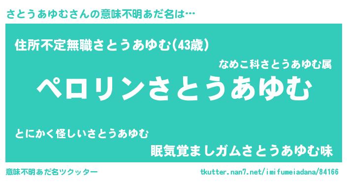 | ヒーロー風カッコイイあだ名 | 『スーパーサトウアユム』『仮面サトダー』 |