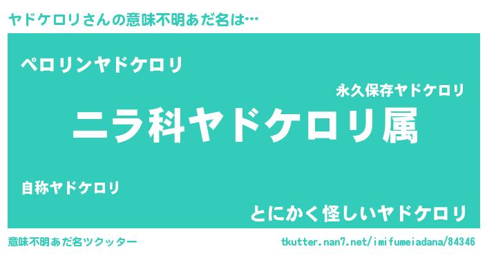 | 男性向けラノベタイトル風あだ名 | 『ヤドケロリ~年齢イコール彼女いない歴の魔法使い~』 |