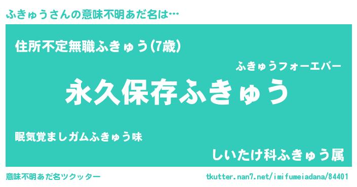 | 男性向けラノベタイトル風あだ名 | 『ふきゅうという概念が存在しない退屈な世界 』 |