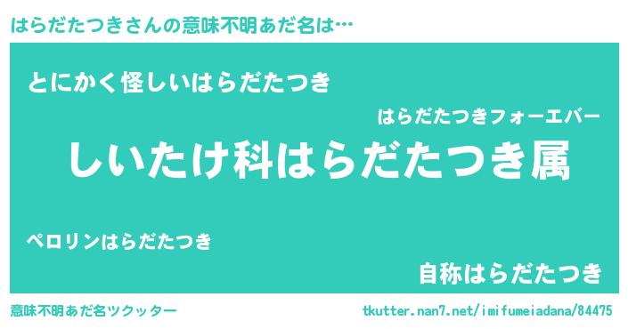 | 胡散臭い通販商品みたいなあだ名 | 『信頼と実績のサプリメント…その名も「はらだたつき」』 |