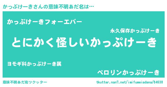 | 男性向けラノベタイトル風あだ名 | 『かっぷけーきの嫁は女の子じゃないと思った?』 |